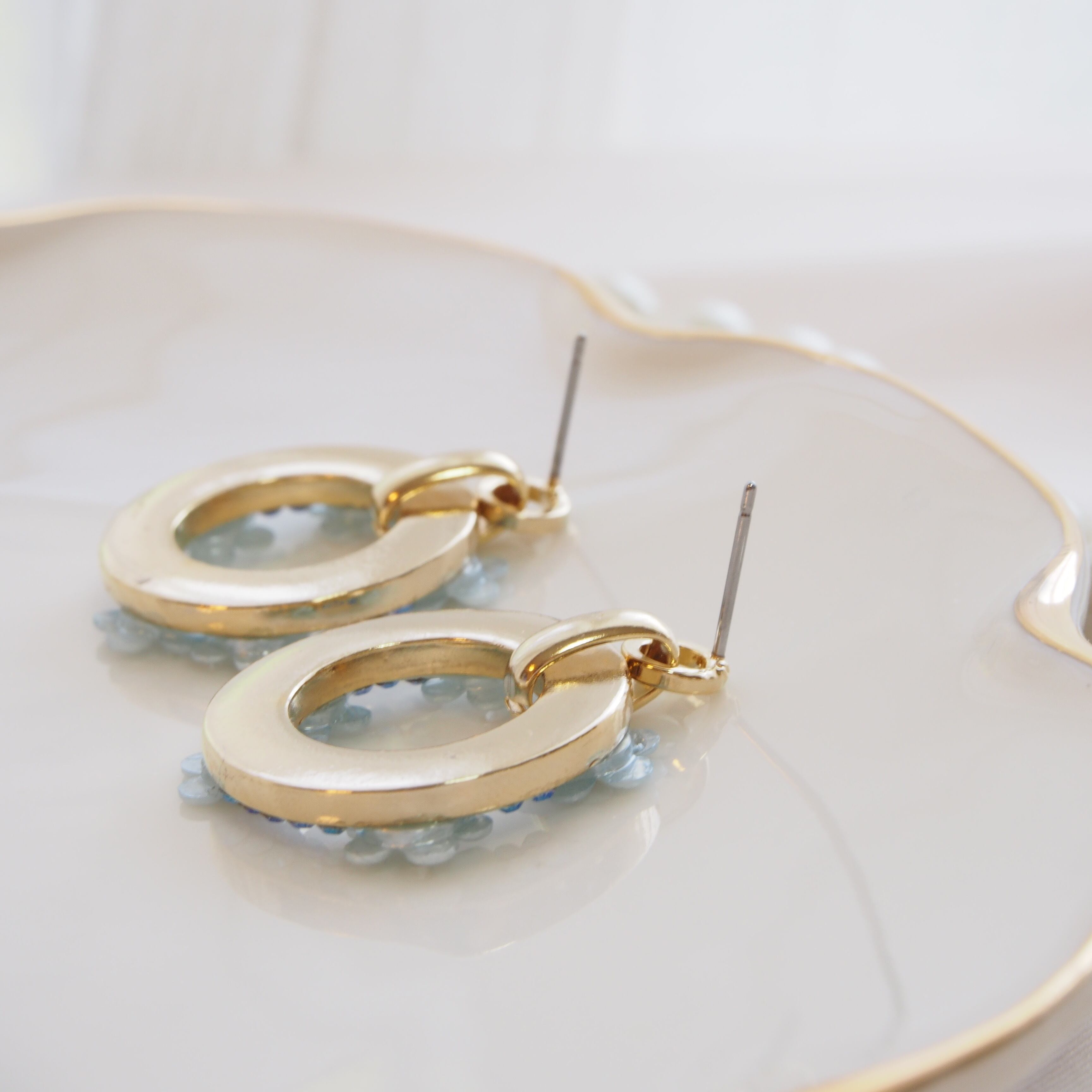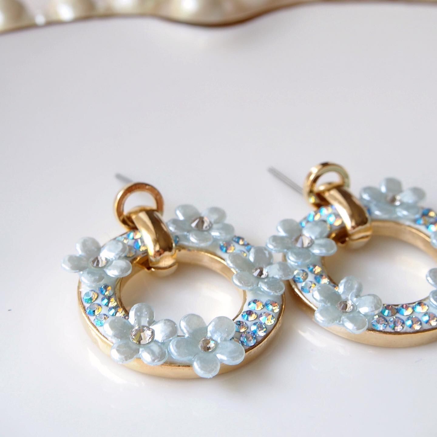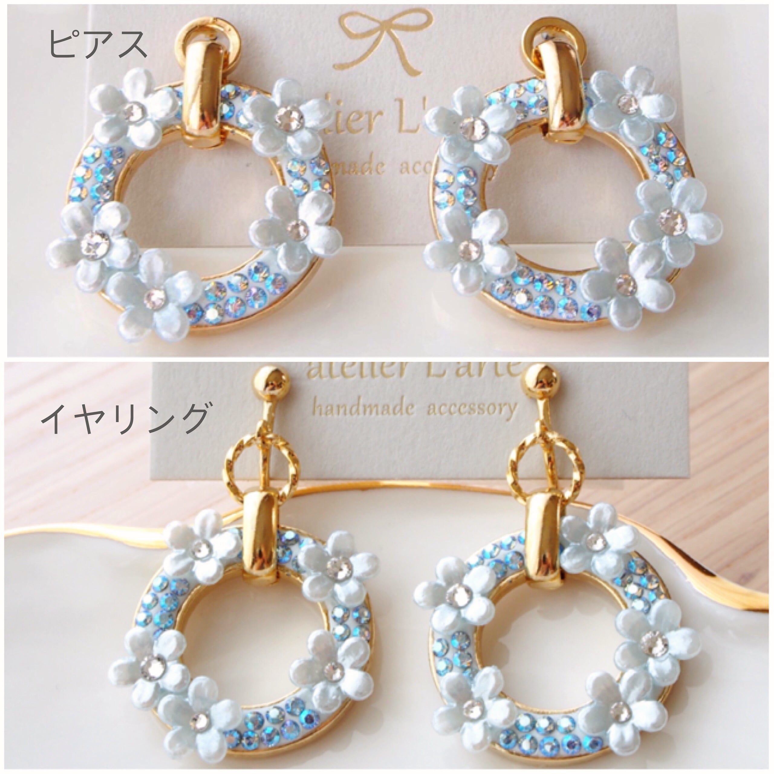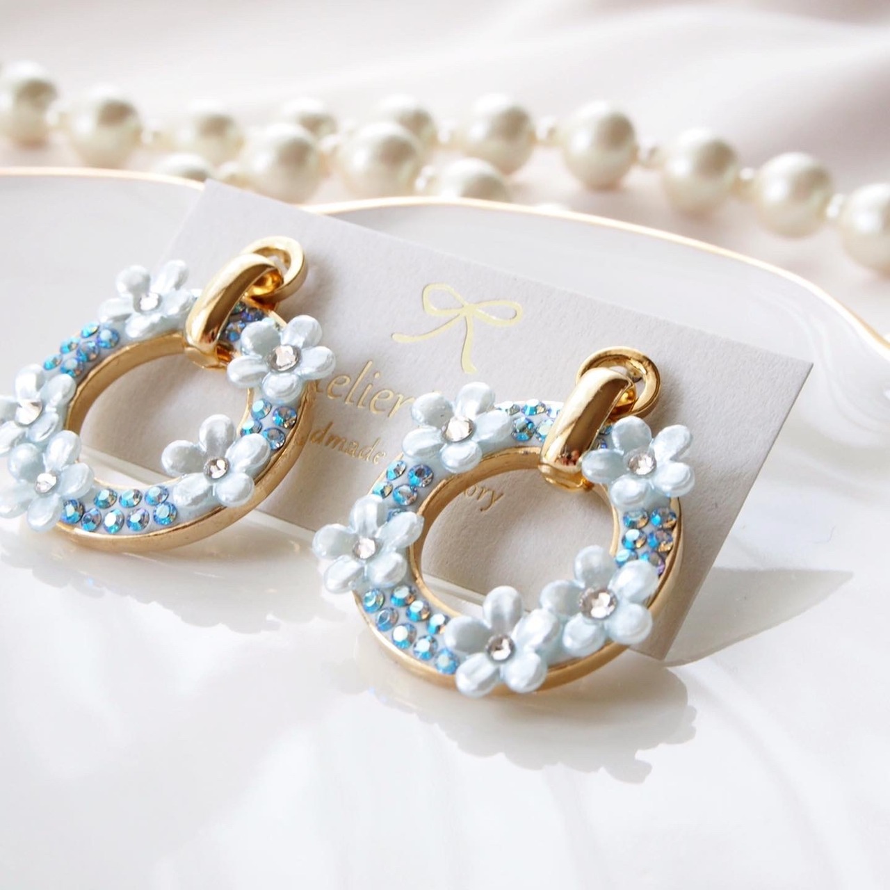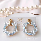 ペールブルーのフラワーリースのようなピアスです。上品で爽やかな色合いに仕上げました。