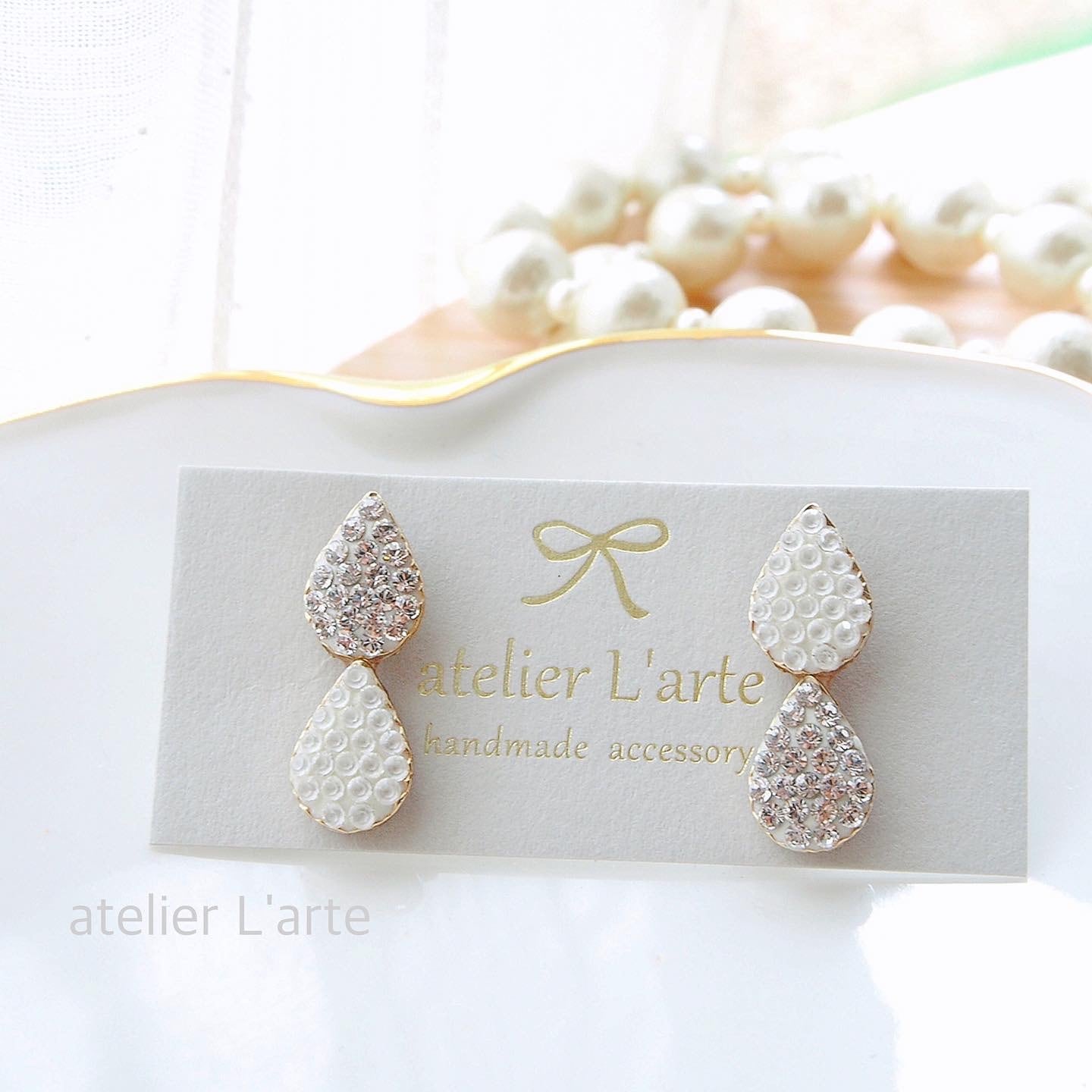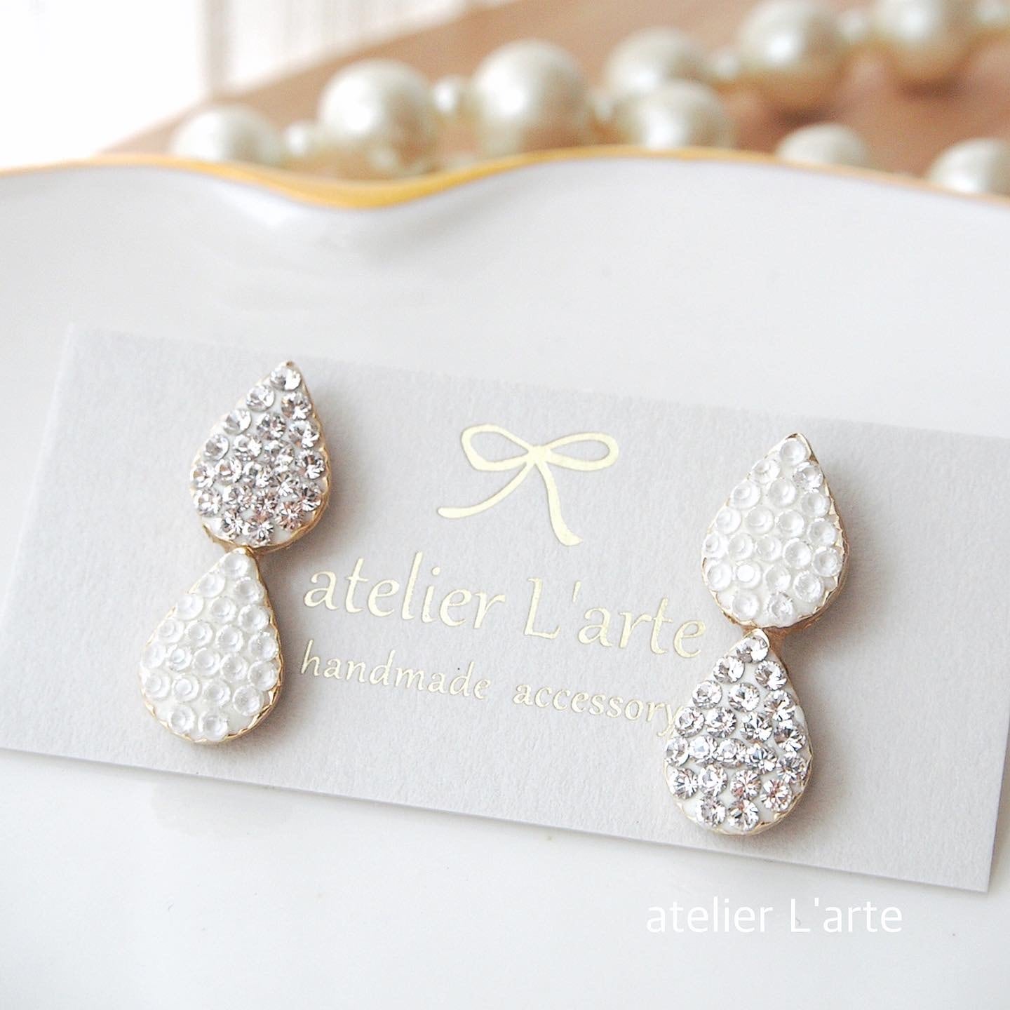 スワロフスキーのデコレーションをほどこしたキラキラのドロップ型のパーツを二つつなげたデザインです。(揺れるタイプではございません)