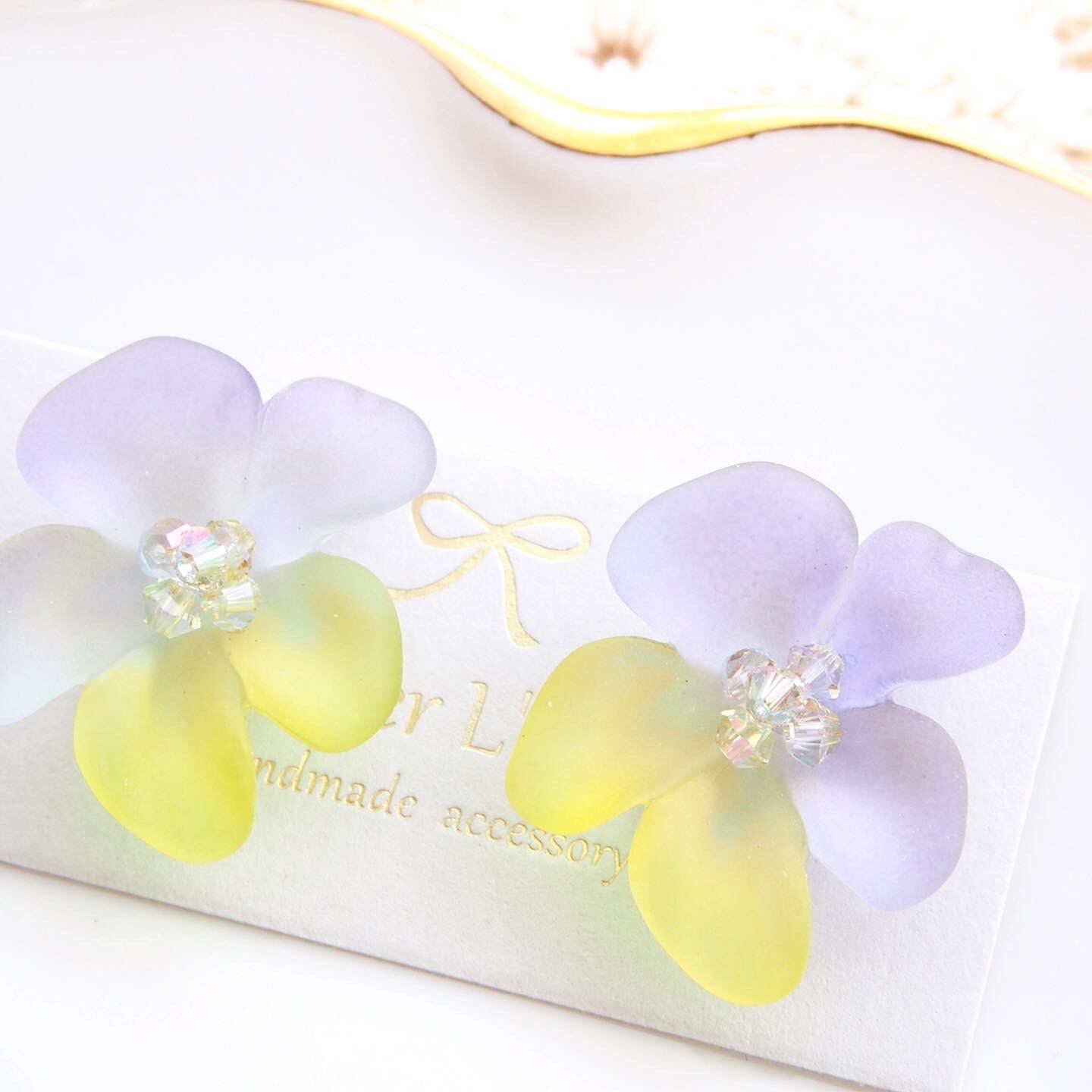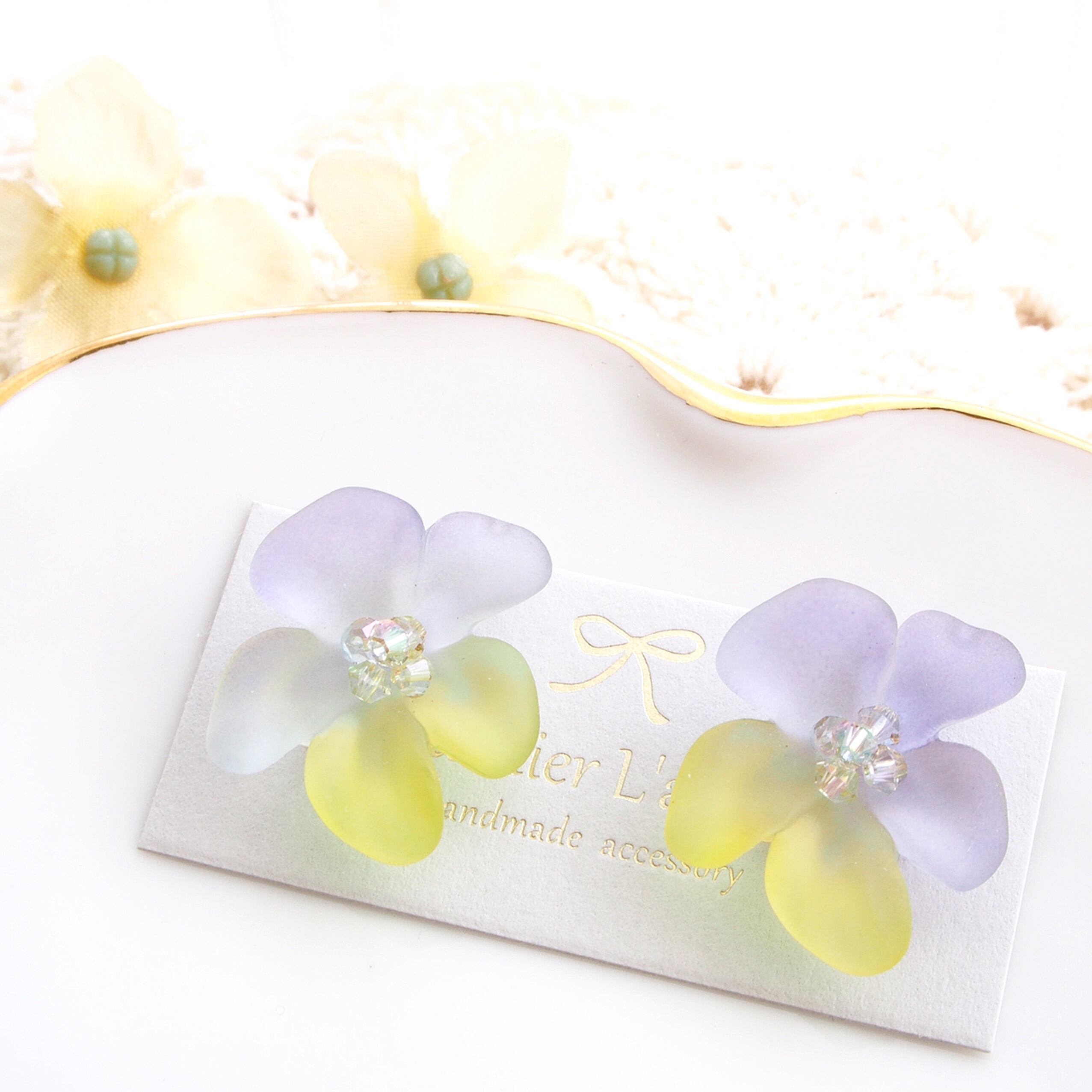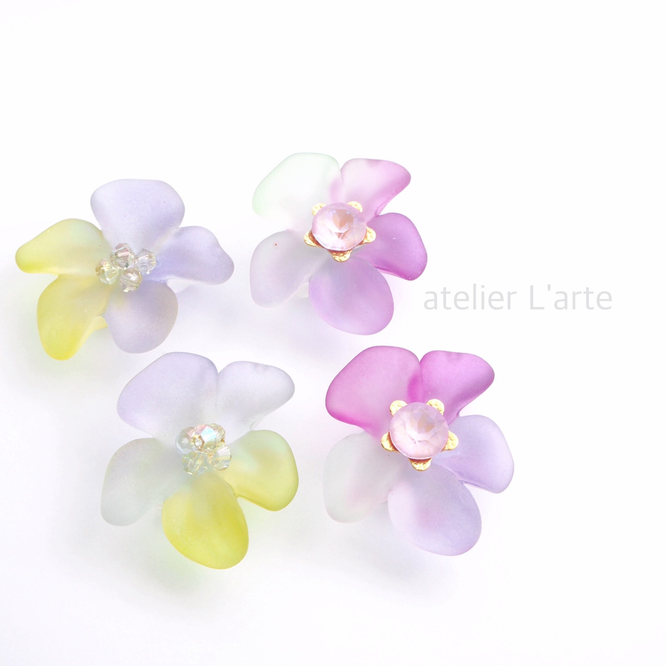 手染めビーズ作家さんの手作業で染められたお花のパーツの可愛さに一目ぼれし、素材の可愛らしさを生かしたシンプルな加工でアトリエラルテらしいアクセサリーに仕上げました。