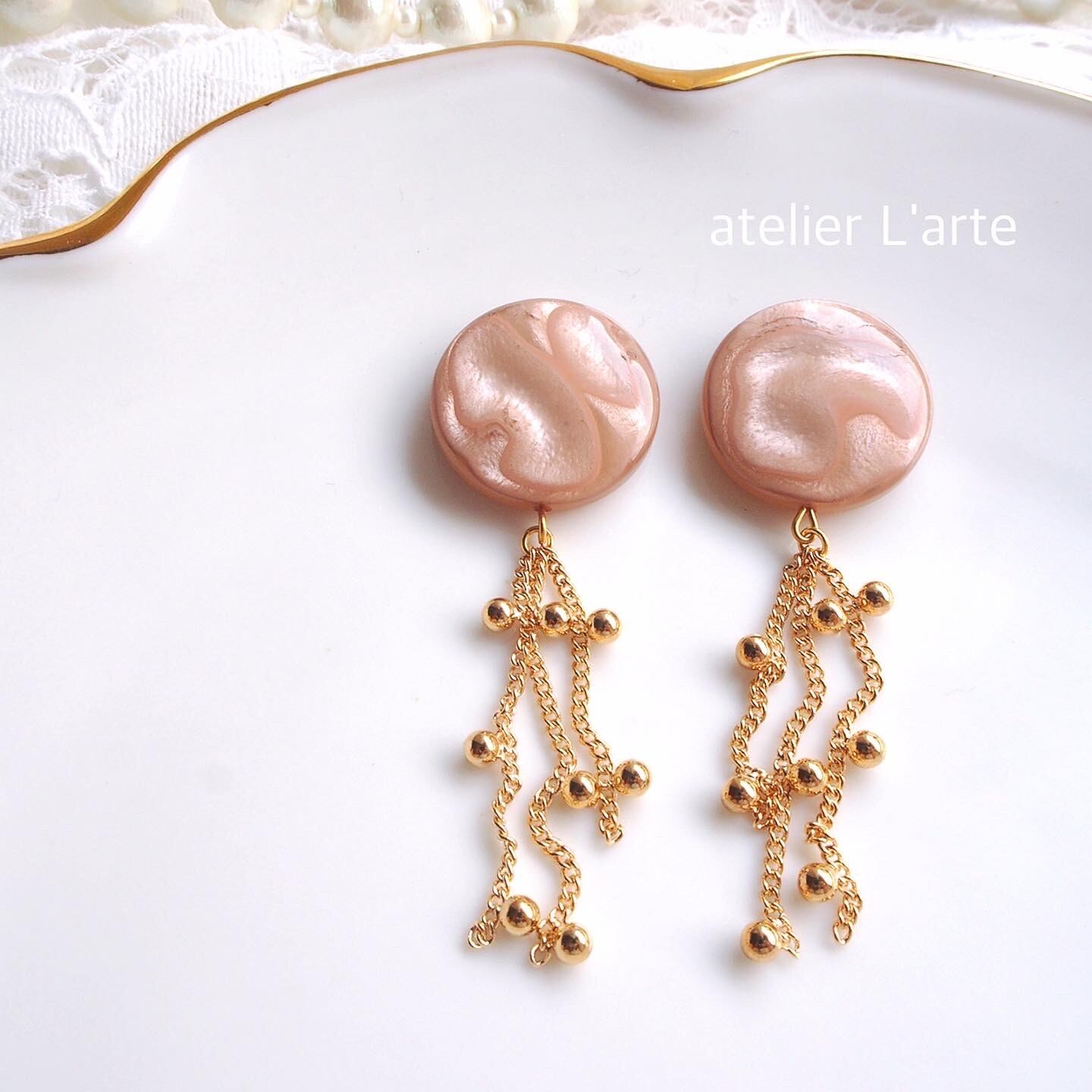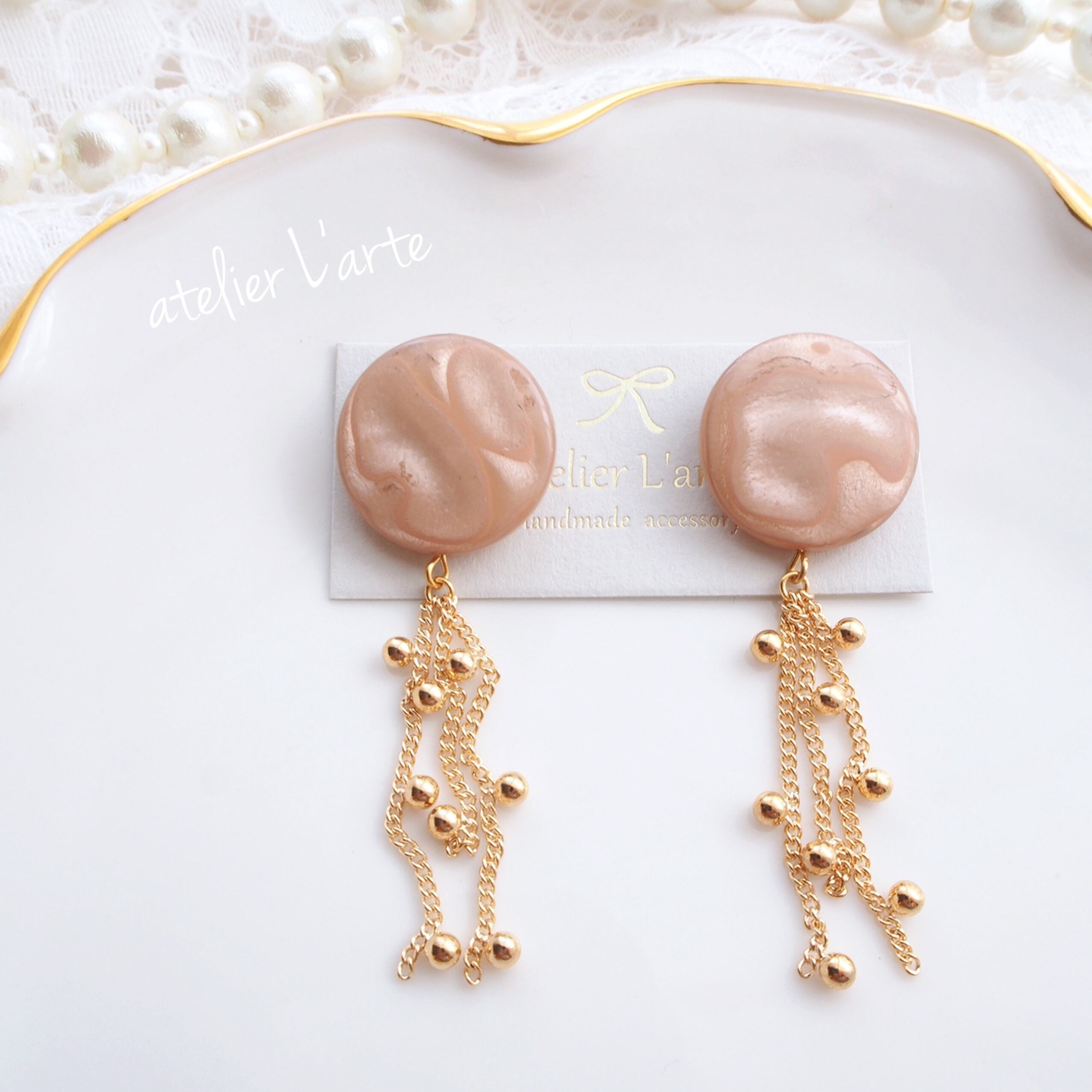 ビーズはベージュカラーで一見地味そうですが、本当に絶妙なマーブル模様が施されており、下に揺れるドットの粒がキラキラするのと合わさると、とても品の良い華やかさと高級感を感じさせる耳元となりますよ。